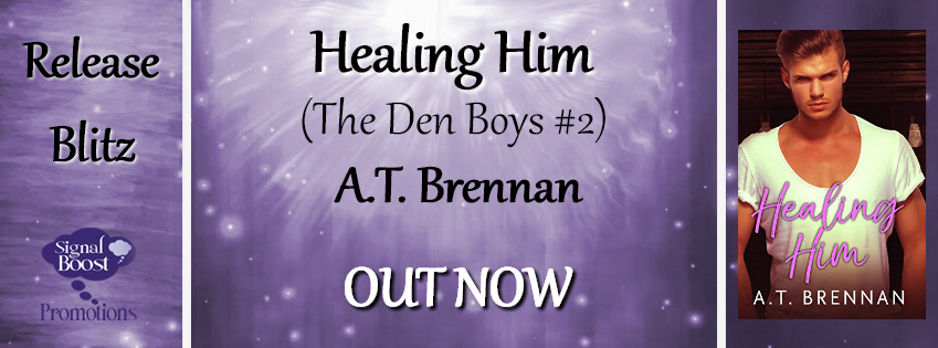 Hi there! Today I’m sharing a review and giveaway for a new contemporary M/M/M menage romance from AT Brennan. HEALING HIM is the second in her The Den Boys series, and features a survivor of child sex abuse finding love and healthy intimacy with not one but two men of his dreams. It’s a standalone steamer!
